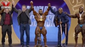 آرنولد شوارتزنگر و رونی کلمن، دو اسطوره بدن سازی جهان، جام و مدال این دوره از رقابت ها را به هادی چوپان اعطا کردند و هر کدام یک دست او را به نشانه قهرمانی بالا بردند. کلمن به دلیل وضع نامناسب جسمانی با عصا روی سن آمد بود.