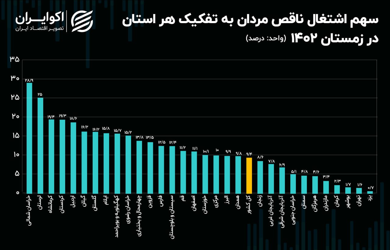 در استان «خراسان شمالی» از مجموع مردان شاغل در بازار کار، ۲۸.۹ درصد، نیمه بیکار بوده اند. بدین ترتیب این استان بالاترین سهم از اشتغال ناقص مردان را در میان ۳۱ استان به خود اختصاص داده است. البته این سهم در یک استان دیگر نیز بیشتر از ۲۰ درصد برآورد شده است. به بیان دقیق تر مردان «لرستانی» نیز در زمستان ۱۴۰۲، سهم ۲۵ درصدی از نیمه بیکاری در گروه مردان را تجربه کردهاند. این نرخ در سایر استانها کمتر از ۲۰ درصد برآورد شده و تنها در یک استان به زیر ۱ درصد رسیده است.
