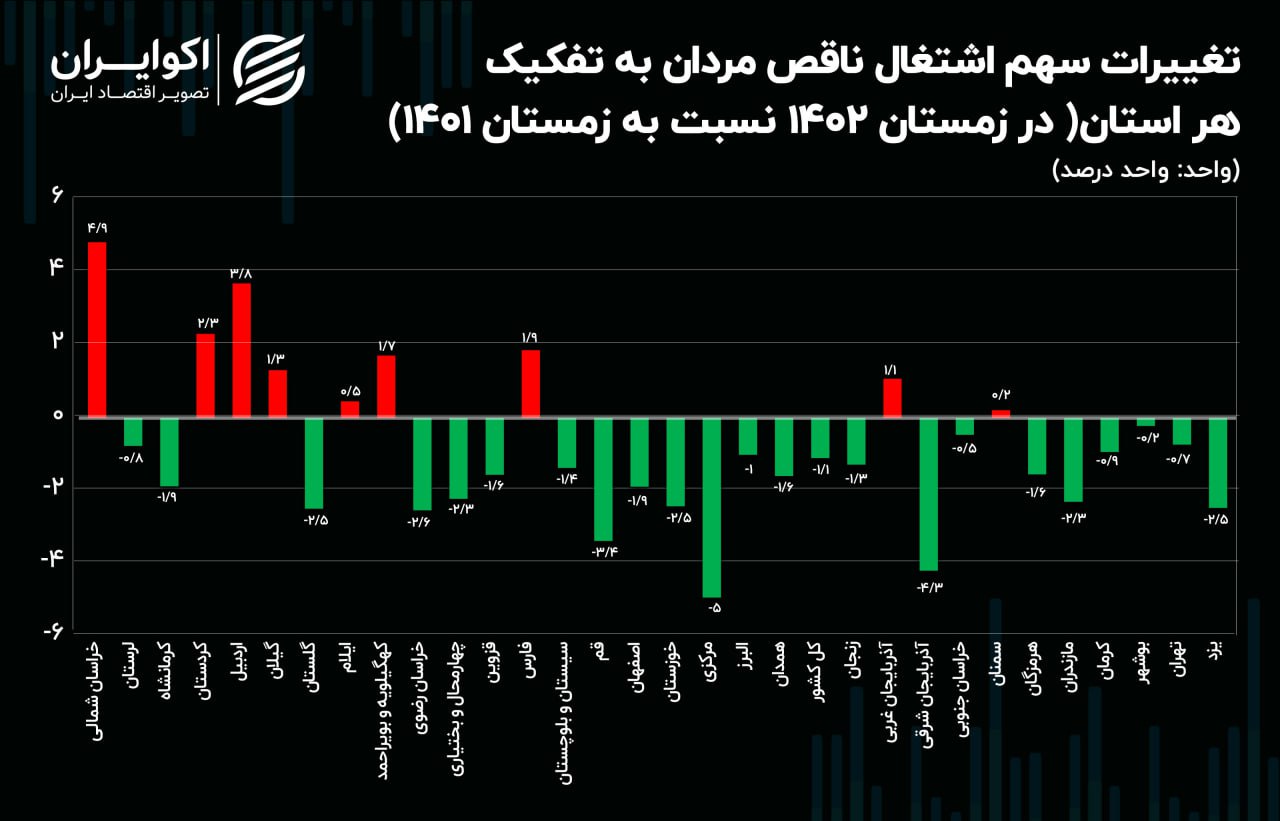 سهم اشتغال ناقص مردان در ۲۲ استان نیز همراه با کاهش بوده است. به بیان دیگر در ۲۲ استان کشور، از جمعیت مردان نیمه بیکار کاسته شده و بهرهوری آنها در بازار کار افزایش یافته است. «مرکزی» و «آذربایجان شرقی» بیشترین میزان کاهش در سهم اشتغال ناقص استانی را در چهارمین فصل سال گذشته نسبت به بازه زمانی مشابه در سال ۱۴۰۱ داشتهاند.